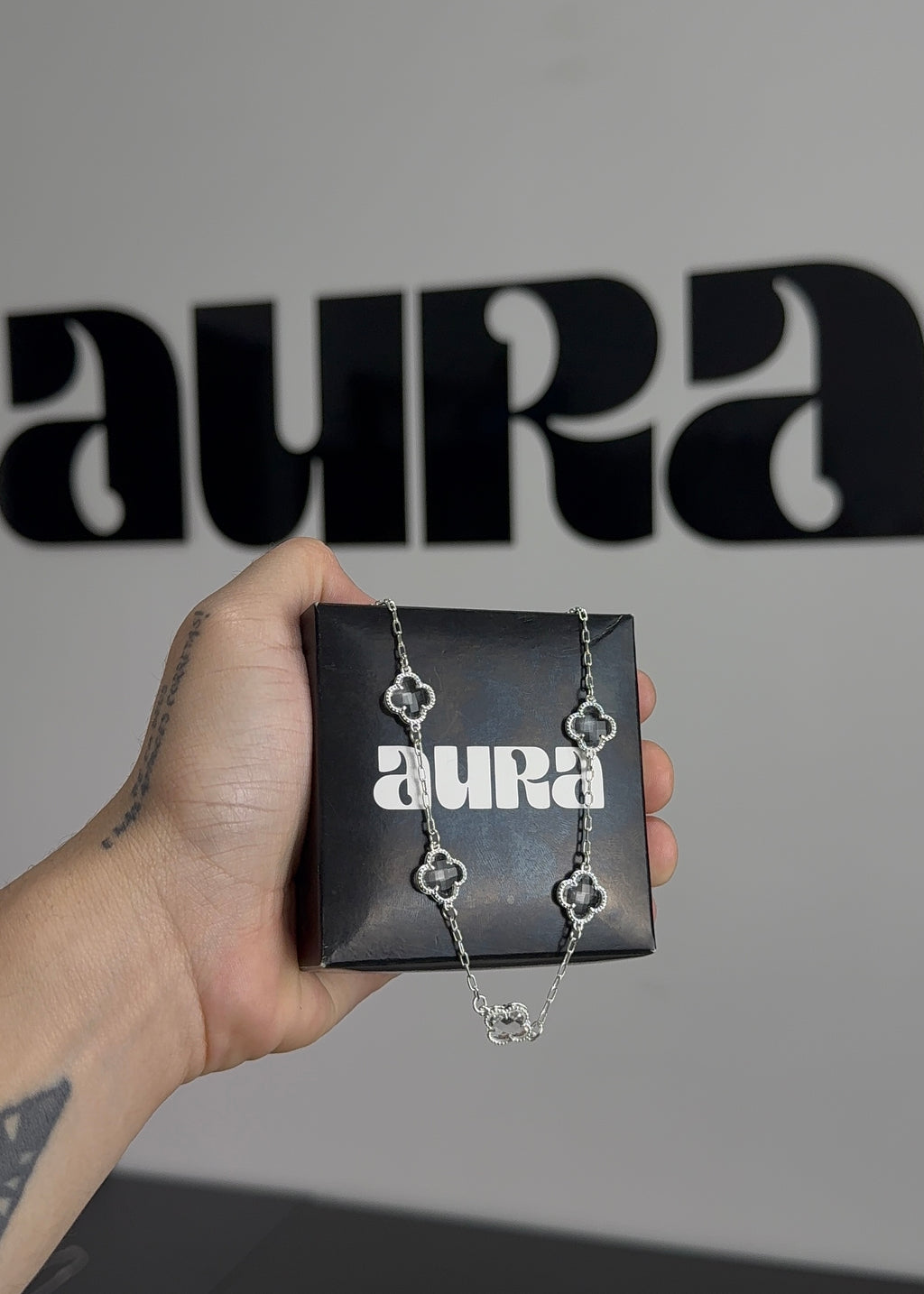 Adicione este acessório elegante ao seu guarda-roupa e encante-se com a beleza atemporal do Colar 5 Trevos Cristal Aura Luxury. ✨🍀💙