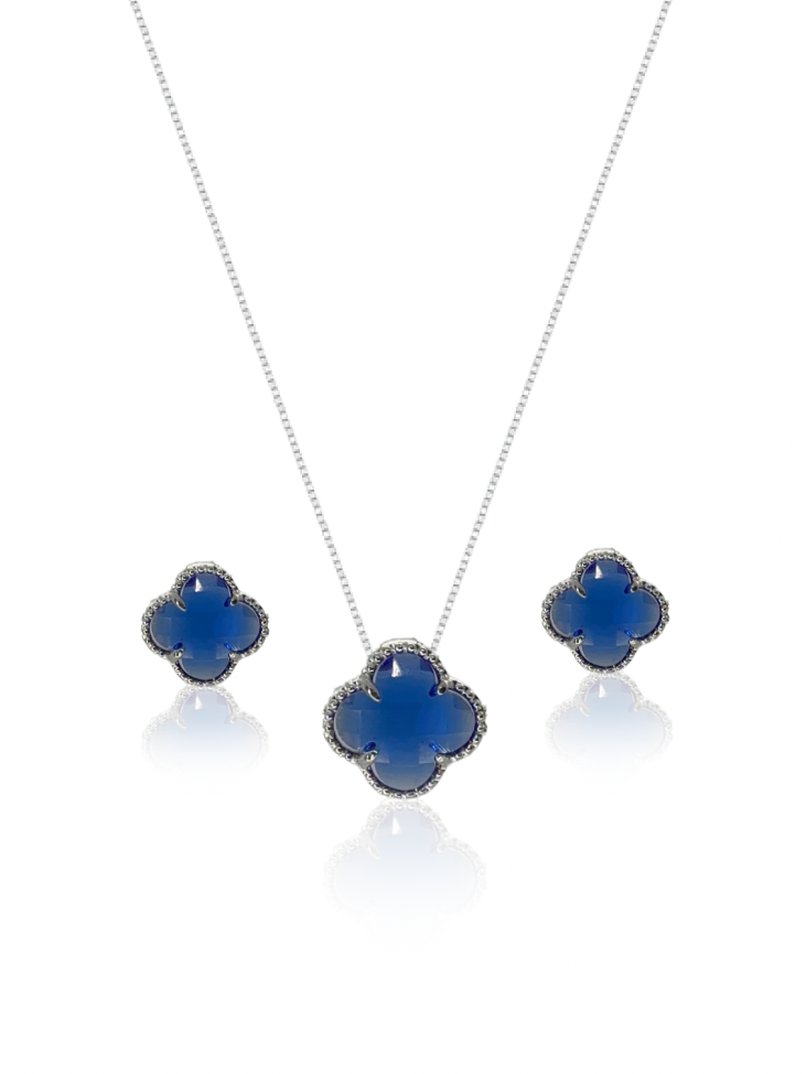 Colar Gargantilha Trevo Azul + Par de Brinco Trevo Azul (Prata 925) (2X1)