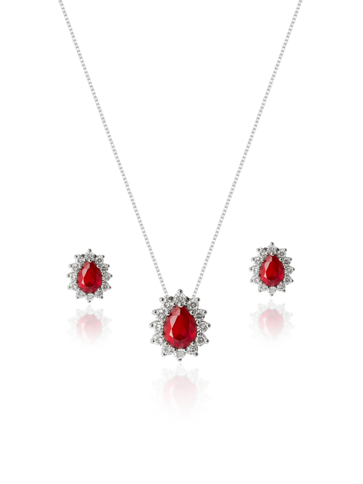 KIT Colar + Brinco, Gota Vermelho Cravejada (Prata 925) (2X1)