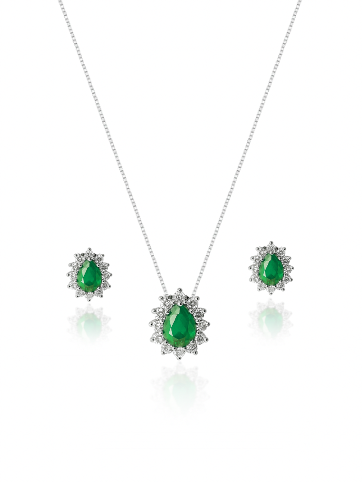 KIT Colar + Brinco, Gota Verde Cravejada (Prata 925) (2X1)