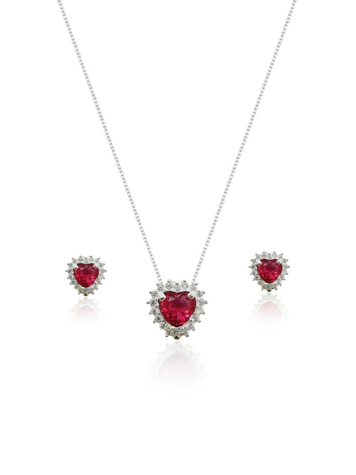 KIT Colar + Brinco, Coração Vermelho Cravejada (Prata 925) (2X1)