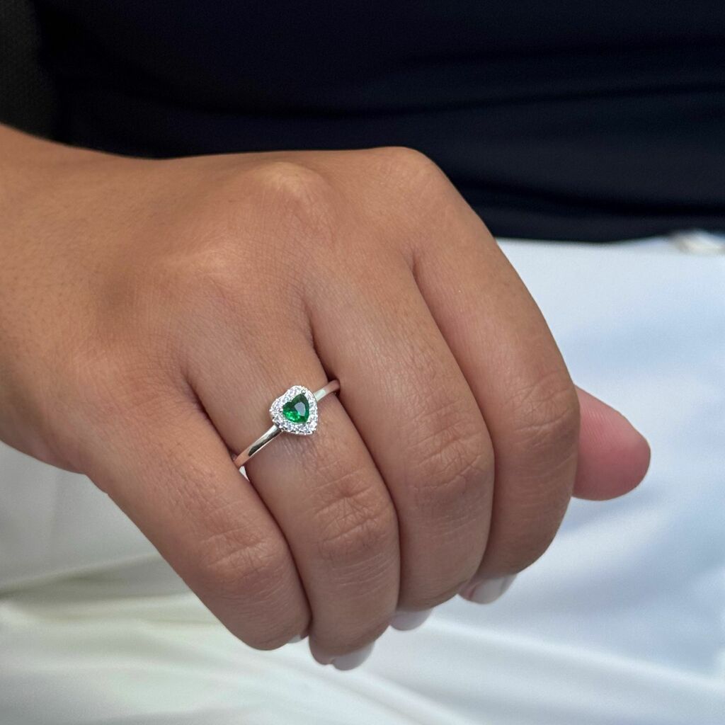 Anel Solitário Coração Verde Cravejado (Prata 925)